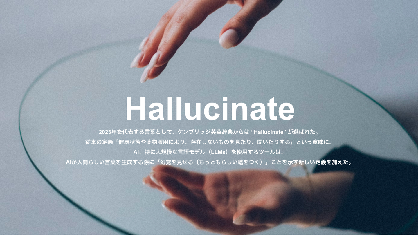 ケンブリッジ英英辞典が発表したのは「Hallucinate(ハルシネイト)」という言葉。「幻覚を起こさせる、実際に存在しないものを見る(見せる)」という意味があります。生成AIが一気に拡がった年。辞典には、「AIは人に幻覚を見せる存在(もっともらしい嘘をつく)」ということを示す定義が追加されました。