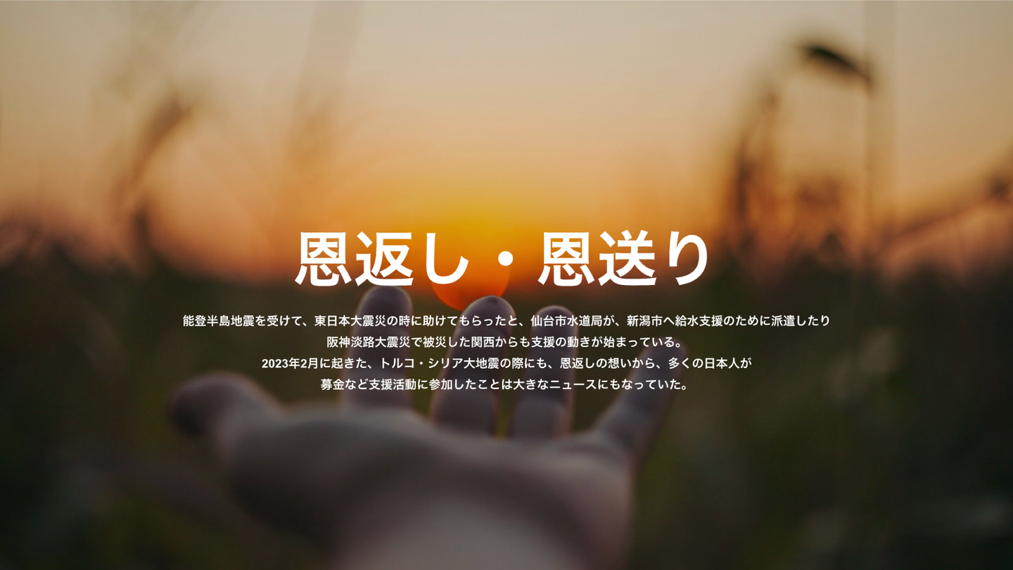 印象的だったのは、震災の翌日以降のこと。東日本大震災の時に助けてもらったから、と支援に動き出す自治体の「恩返し」や「恩送り」の姿がありました。2023年2月に起きたトルコ地震では、多くの日本人がトルコ大使館に募金のために駆けつけました。それは、100年以上前から「恩返し」の関係にあったからです。