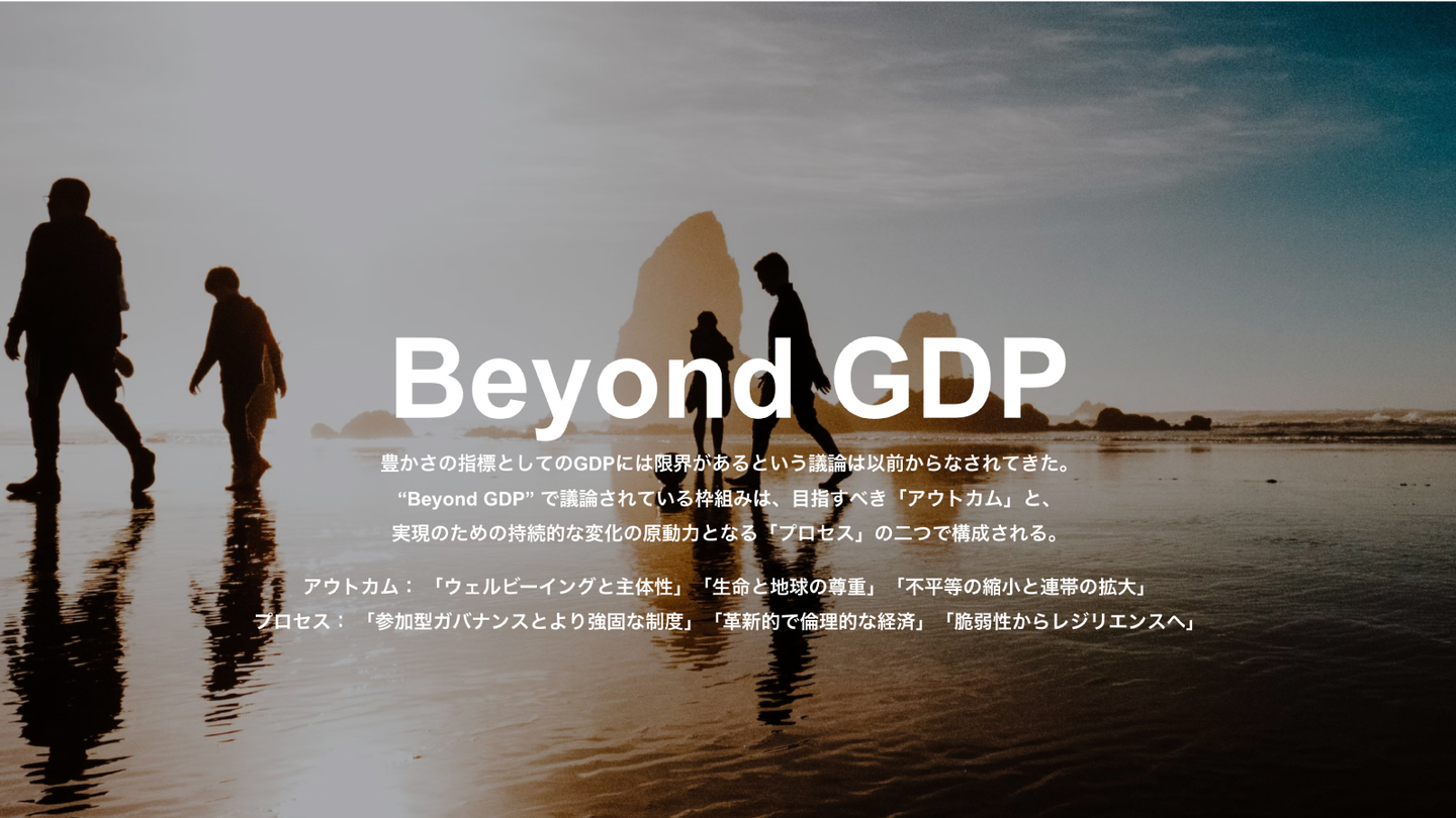 画一的な社会の姿や、環境への負荷が蓄積された今までの経済の豊かさは、GDP(国内総生産)で測られていました。でも、これには限界があると言われてます。GDPが右肩上がりの国は、ウェルビーイングが相関して下がっていく、というデータもあります。