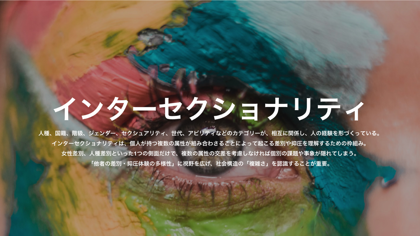 「インターセクショナリティ」という考えがあります。先ほどの職業の画像にあったような、画一性の観点だけを排除するのみが結論ではありません。個々を取り巻く属性を理解して、マイノリティの中でも焦点が当たりにくい所にまで目を向けることができるか。例えば、「女性差別が社会問題」ということだけを掲げてしまうと、階級や人種などの属性が交差する課題が取り残されてしまう。より複合的な枠組みを考えていくことが、インターセクショナリティです。人は、自分が経験したり知っている世界でしか想像することができないからこそ、自分自身が経験してないことに出会ったり学んでいくことが大切なのです。