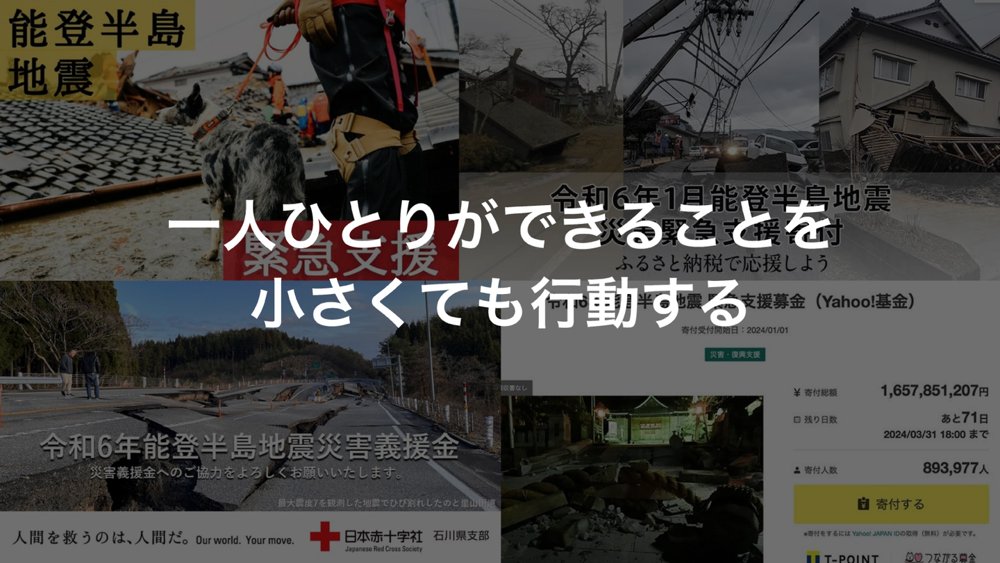 元旦に、石川県能登地方で大きな地震がありました。FICCの中にも、支援のアクションを起こした人もいるかもしれません。認定NPO法人ピースウィンズ・ジャパンが行う現地の緊急支援チームへの募金や、ふるさと納税を利用した返戻金のない支援、日本赤十字社の石川県支部へのサポートなど、私たちも参加できる支援も。数日前には、Yahoo!基金では、既に十数億円の寄付が集まっていました。