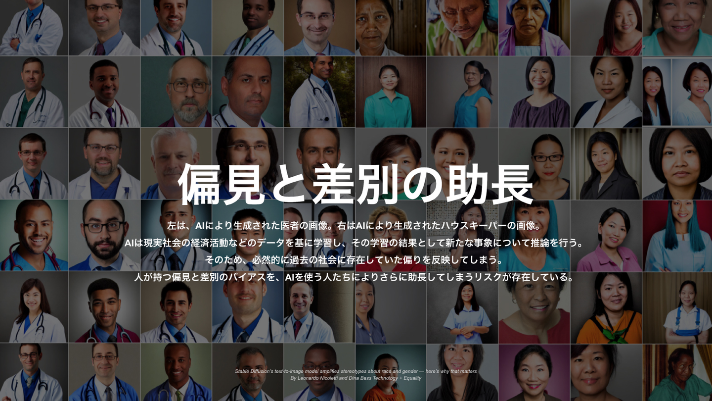 これを見てみてください。AIが生成した医者の写真とハウスキーパーの写真。性別や人種においても、画一的な画像ですね。でも、私たち人が作ってきた社会のイメージやコンテンツから生成されています。AIを使う私たちは、偏見や差別を助長するリスクがあることを理解しなければなりません。短絡的に判断するのではなく、知って学んでいく必要があります。