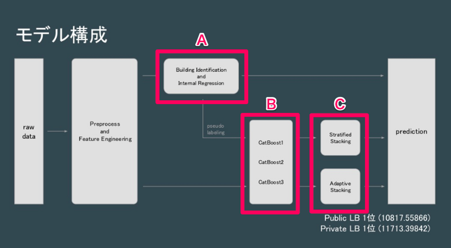 今回のテーマで難しかったところは、AとBとCの三段構造にしたところですね。最初は二段構造にしたんですけど、最後の方で三段に変えて3つの解析モデルを組み合わせた結果、精度が大きく向上しました。それが今回工夫したところで、結果的に一位になった理由ですかね。
