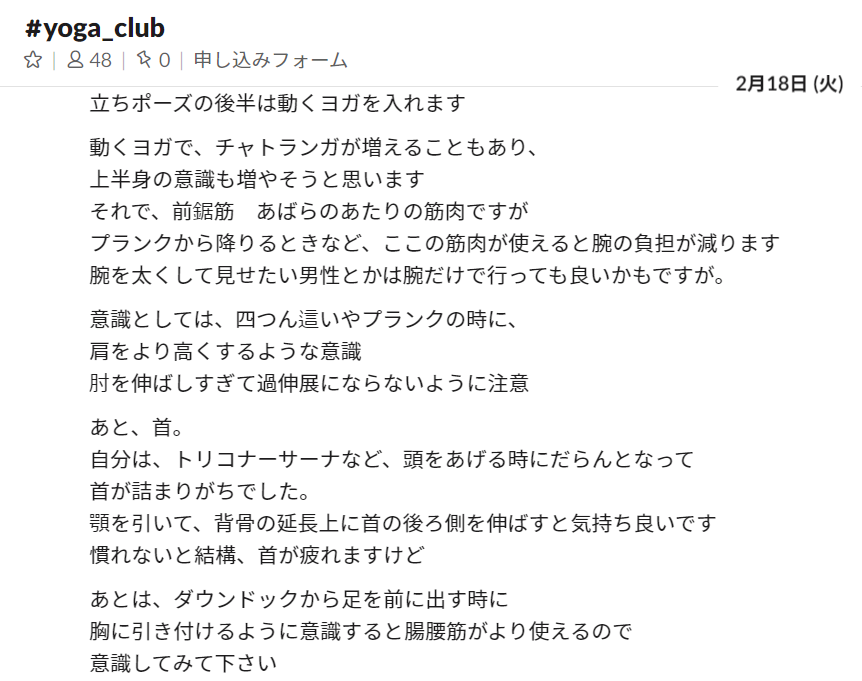ヨガ部は月に2-3回、全社朝礼やイベント等を行っているFiNC大ホールで開催してます。講師を務めるのはrubyエンジニア 兼 ヨガインストラクターを目指してる児玉さん。ヨガに約7年通ってからインストラクターの資格を取得したそうです。ヨガ部のslackチャンネルでは、事前にテーマが送られてくるので、しっかり事前に予習しておきます。