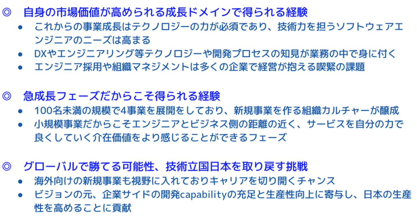 事業(セールス、CS、US、マーケティング)の皆様にとって、今後あらゆる産業で必要となるエンジニア領域で、顧客やユーザーの声を聞きながら、スタートアップでオペレーションを作っていく経験は今後のキャリア形成にとって非常に価値あるものになると思っています!
