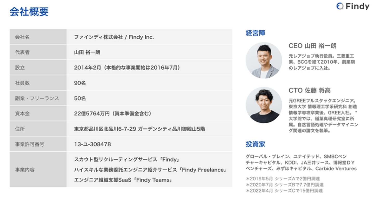- エンジニアが生み出す価値の大きさを、アメリカテック企業のIndeedで体感してきており、優秀なエンジニアがいる会社を買収するということをしてきた。全世界で優秀なエンジニア採用の需要、開発力を高める需要が上がってきているため、世界で勝てる日本発テックカンパニーの創出に貢献できるファインディのビジョン及び事業内容に共感した