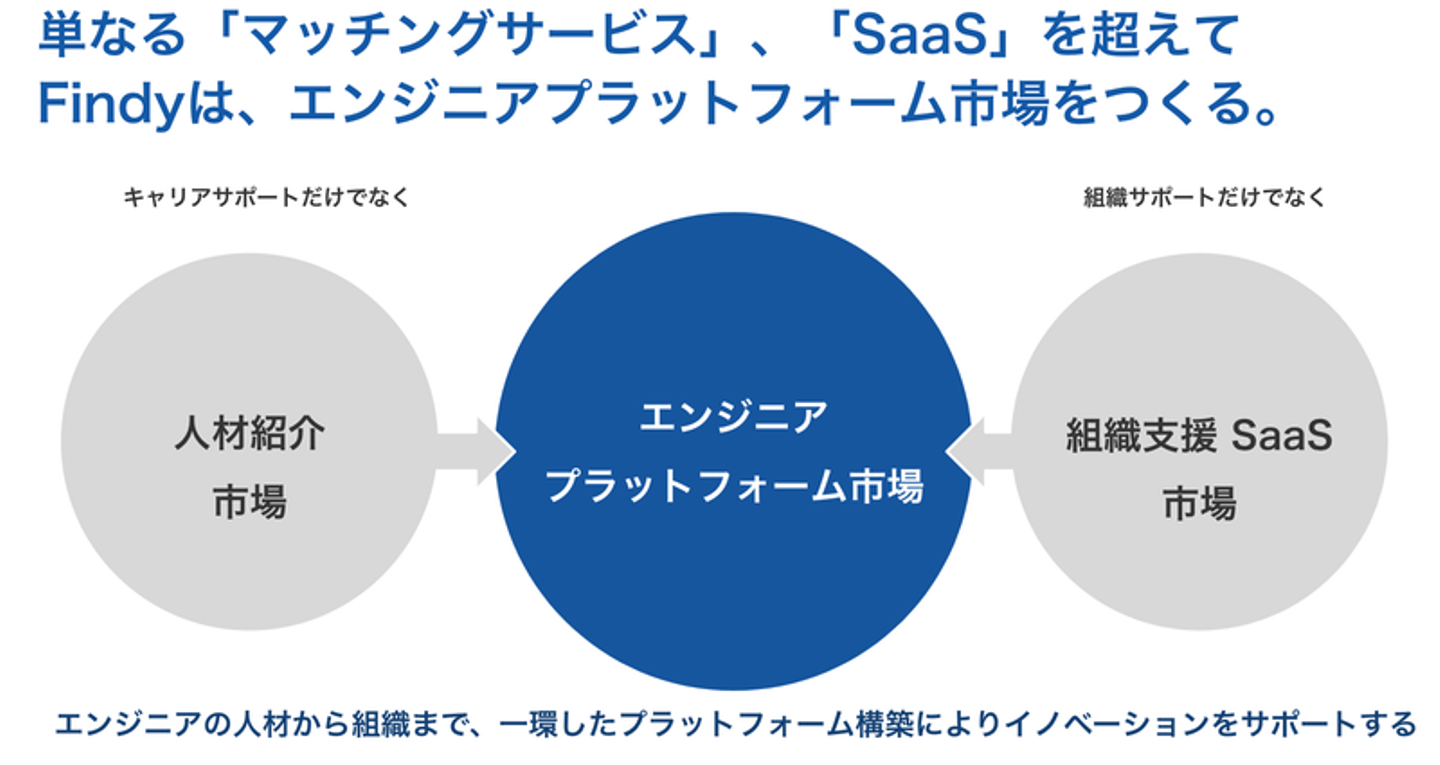 つまりは、ファインディは、エンジニアのマッチングだけでなく、また、エンジニアの組織支援だけでなく、エンジニアのプラットフォームという新しい概念・市場を作ることを通して、テクノロジーの力で世の中をもっと良くしていきたい会社