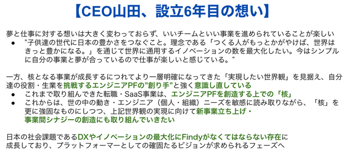 - エンジニアを事業ドメインとしているのが良いと思った。自身の経験してきたHR tech事業・Finance・海外駐在勤務経験を活かし、ファインディの成長にコミットしたいと思った