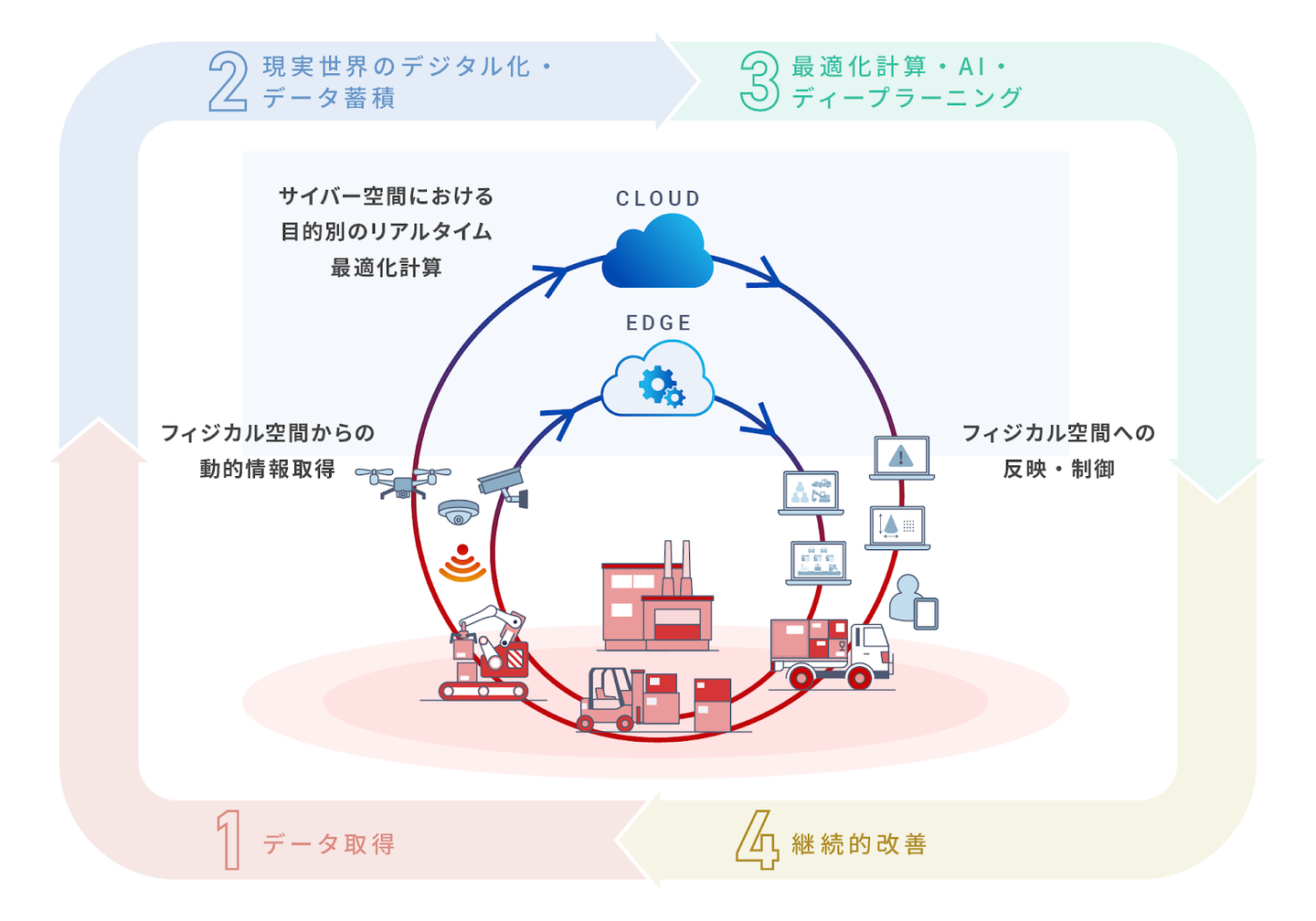 CPSとは、実世界(フィジカル空間)にて人やモノの動きをデータとして取得し、取得したデータをサイバー空間にて人工知能技術(機械学習)を用いながら情報の抽出や解析を行う仕組みのことで、当社はCPSによるお客様の意思決定支援の可視化や最適化を実現しています。