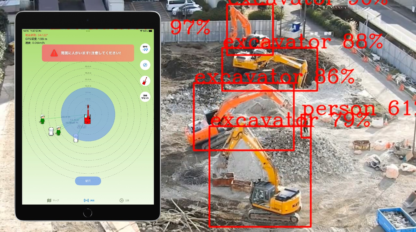 建設現場に設置した複数台のカメラから現場にあるモノや人の動きを記録、システム上で認識し(下図右部分)、地図上にリアルタイムでプロットすることができます。地図上に位置情報をプロットしたうえで人や一般車両が重機に近づくと重機内に設置したタブレットの画面上にアラートが出ます(下図左部分)。