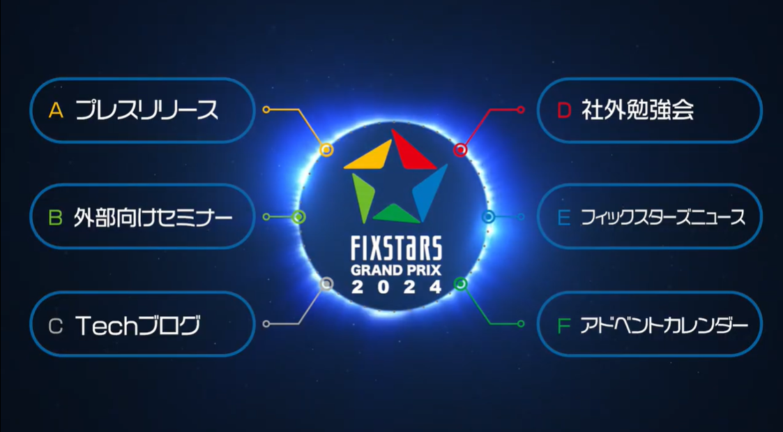 「プレスリリース」「外部向けセミナー」「Techブログ」「社外勉強会」「フィックスターズニュース(社内新聞)」「アドベントカレンダー」の6つの部門で活躍した社員がそれぞれ3位まで発表されます。セミナーや勉強会の場合は参加人数や実施回数、ブログや記事系は閲覧数などが判断基準となります。そして、各部門で1位の社員の中から更にグランプリを決めよう、という新しい試みです!リアルタイムで投票してグランプリが決まります。