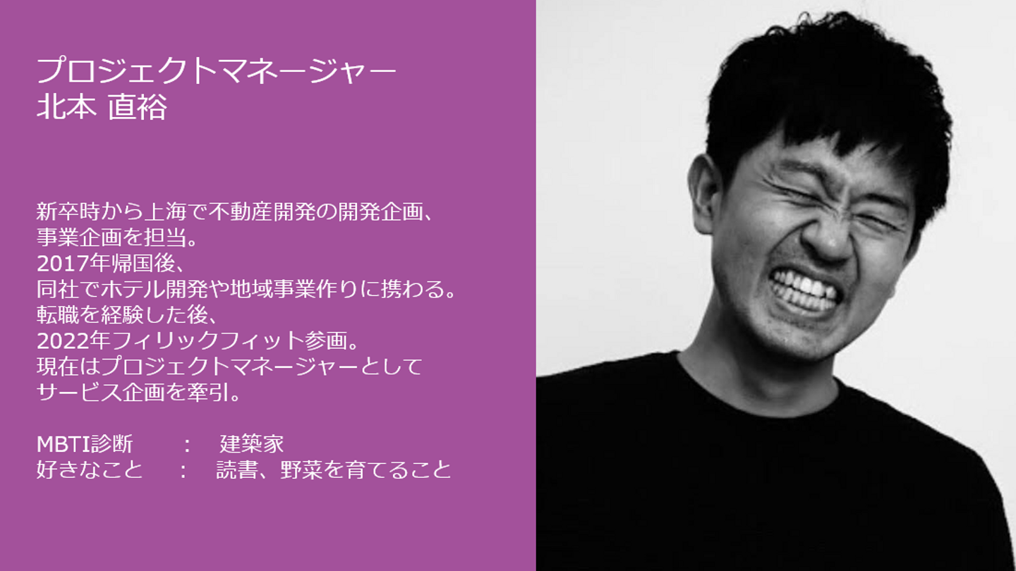新卒時から上海で不動産開発の開発企画、事業企画の仕事をやってきました。2017年ぐらいに日本に戻ってきて、そこから同じ会社でホテル開発とか地域事業作りに携わってきました。その次の会社でも企画事業を担当する中で、フィリックフィットと一緒に仕事をしたことがきっかけで、フィリックフィットに入社しました。入ろうと思った理由は、受託ではなく事業サイドとして事業開発、ブランドの立ち上げ、その後の事業を成長に関わる経験してみたかったからです。やってみるとどういう風景が見えるんだろう、と興味を持って転職しました。