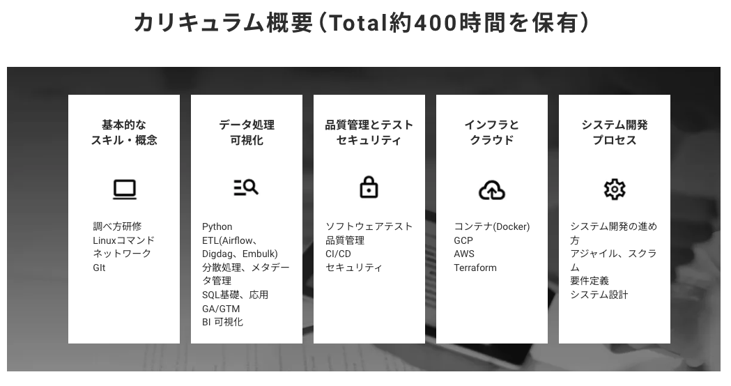 基礎的なエンジニアリング技術を学ぶだけでなく、データエンジニアリング研修、クラウド研修