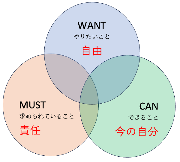 MUST(SHOULD) - WANT - CANのベン図に(無理やり)当てはめるとこんな感じ。(自己制作クオリティ)