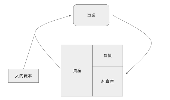 さて、ここまで個人の資産についての話をしてきました。一方会社の立場としてもやはり人的資本は大事です。特に我々のような開発会社にとっては人こそが力の源泉であるといっても過言ではないかと思います。しかしながら、人的資本の数値化、特に金銭的価値の算出が難しいのは想像に固くありません。したがって財務諸表である本家の B/S に取り入れられることはなく、B/Sをみただけでは会社が保有する人的資本はわかりません(P/L には人件費が費用として現れますが、人の能力や人と人とのつながりはわかりません)。B/S の外にあって、事業の推進を助ける何かという位置づけです。