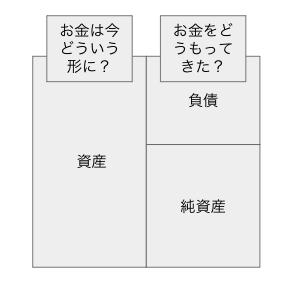 お金の持ってきかた(右)としては、自分の持ってるお金か(純資産)、他人から借りてきたお金(負債)があります。資産(左)の方は現金や不動産など、右で調達してきたお金がどういう形になっているのかを表現しています。調達したお金が何らかの形になっているので左右のバランスが取れるんですね。なんの形にもならなかったお金(飲み会でパーっと使った、など)は、左の資産からは現金が減り、右からは純資産が減り、結果として全体の資産が減ってバランスが取れます。