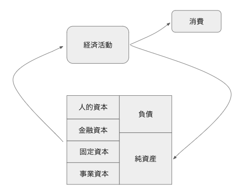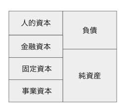 人的資本は自分の稼ぐ力、金融資本は現金や株など、固定資本は不動産など、事業資本は自分がオーナーの事業です。このように捉えると、英会話教室に通ってコミュニケーション能力を鍛えるのは金融資本→人的資本への資本移動ですし、自宅購入は負債(住宅ローン)を増やして固定資本を増やすことに相当します。