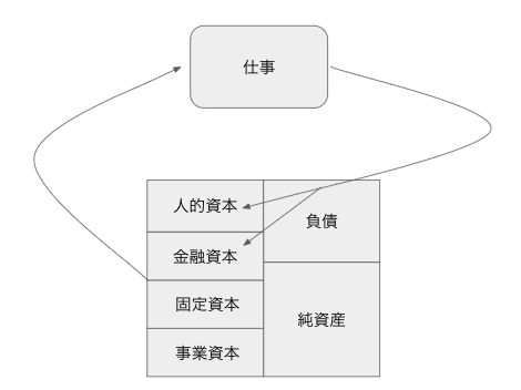 さて、ここで仕事という経済活動について考えてみましょう。仕事が個人の資産に対して寄与するのは、給与(金融資本)と、スキルや人とのつながり(人的資本)です。