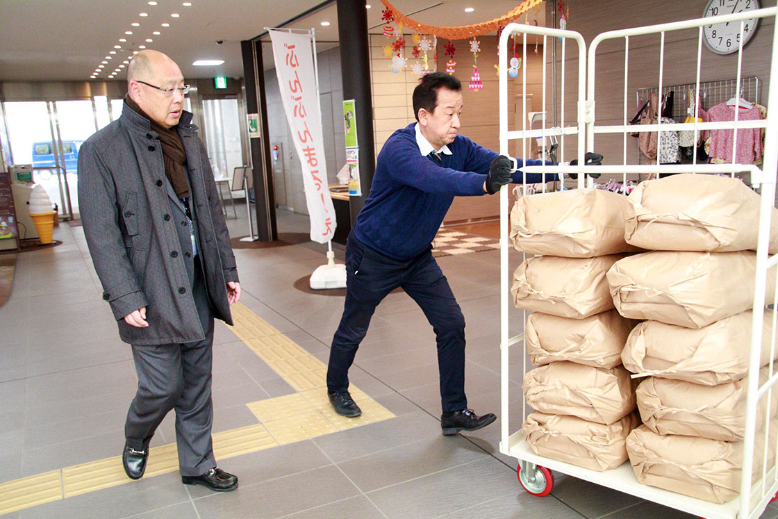お米の搬入の様子。本村会長自ら、現場に立ち会いました
