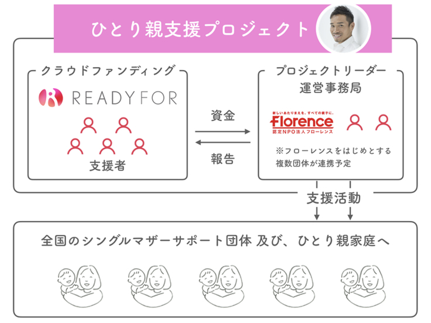 そんな状況を知り自身もひとり親家庭で育った長友佑都選手が、ひとり親家庭を支えるためにプロジェクトを立ち上げました。クラウドファンディングで資金を集め、国内の親子領域の課題解決実績をもつ認定NPO法人フローレンスを協働パートナーにひとり親家庭に直接支援を、さらにはひとり親家庭の全国ネットワーク、全国の団体を通じてひとり親家庭や経済的に困窮する家庭を支えます。