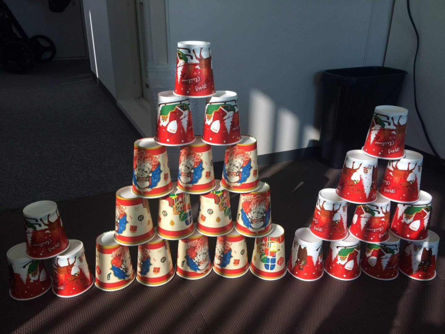 例えば、紙コップ倒し。保育スタッフと一緒に紙コップを積んで倒すことを繰り返して楽しむ遊びです。