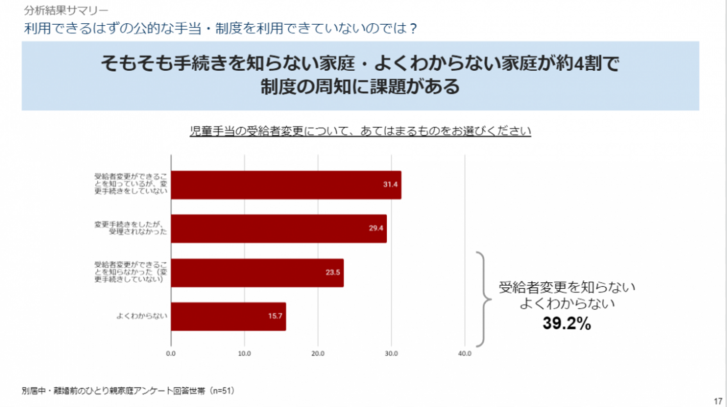 ・さらに、私たちの調査では、対象家庭の多くが「児童手当の受給者変更手続きについて知らない・よくわかっていない」ということがわかっています。そのため、今回の給付についても、迅速に進むほど、多くのノーセーフティネットひとり親家庭が知らないうちに、対象から漏れてしまうことが予想されます。そこで、国・自治体主導にて児童手当の受給者変更が可能であることの周知をわかりやすく行うと同時に、受給者変更が今回の10万円支給に間に合わない場合にも遡及措置が可能になるよう、柔軟な対応をお願いします。
