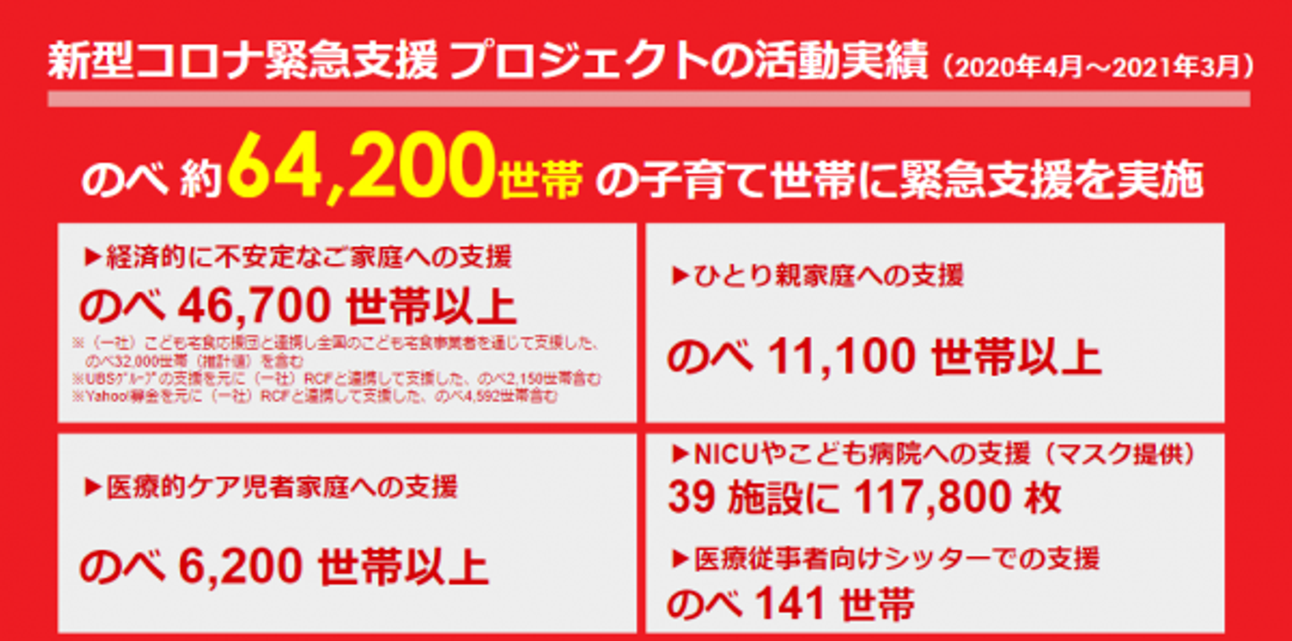 フローレンスでは、新型コロナウイルスの感染拡大の状況を受け、2020年4月より「新型コロナこども緊急支援プロジェクト」を立ち上げました。多くの個人や法人企業の皆さんから託していただいた寄付を原資に、特にコロナ禍の影響を強く受けるひとり親家庭や経済的に厳しい状況にあるご家庭、医療的ケア児者家庭など2021年3月までにのべ64,200世帯以上への支援を実施しています。また、医療崩壊が懸念された昨年1月には医療従事者向けの緊急支援も実施しました。