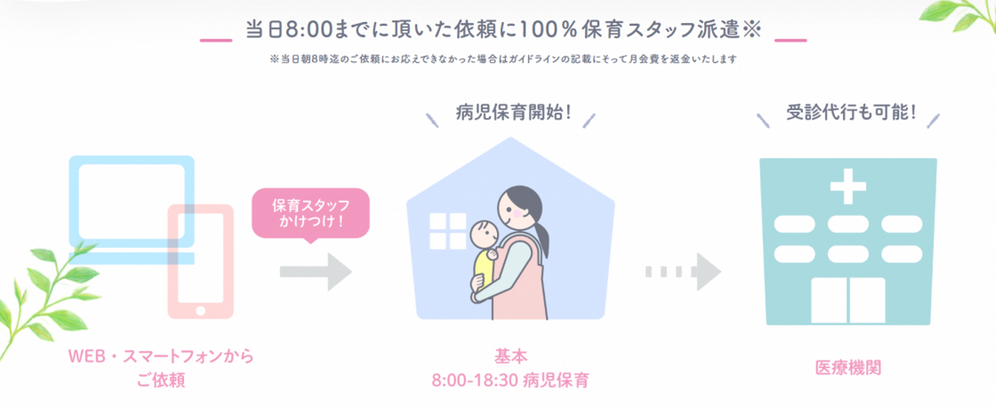 そんな時に、フローレンスの会員になればすべての場面で100%、自宅に保育スタッフがお伺いして、サービスを受けることができます。