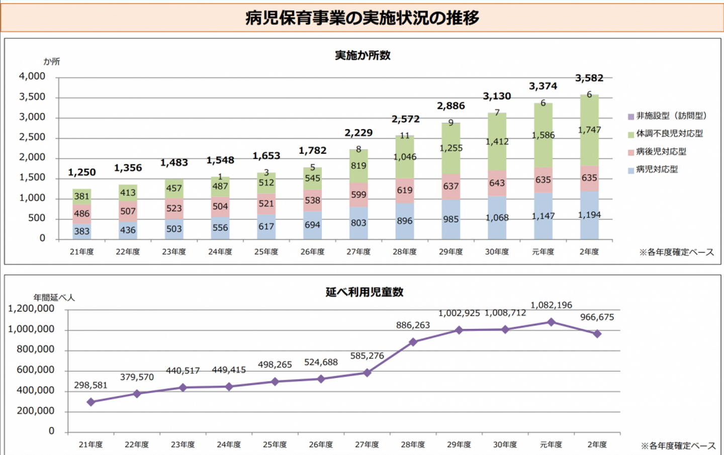 厚生労働省がまとめる「各自治体の多様な保育(延長保育、病児保育、一時預かり、夜間保育)及び障害児保育の実施状況」※では、全国で病児保育を実施している施設数は3,582ヶ所です。