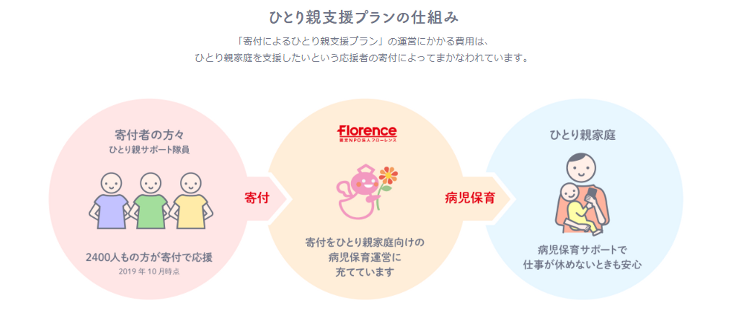 2008年には、訪問型病児保育を通してひとり親家庭が安定的に働ける環境を提供し、就労、そして家計の安定を支援するため、「寄付によるひとり親支援プラン」をスタートしました。