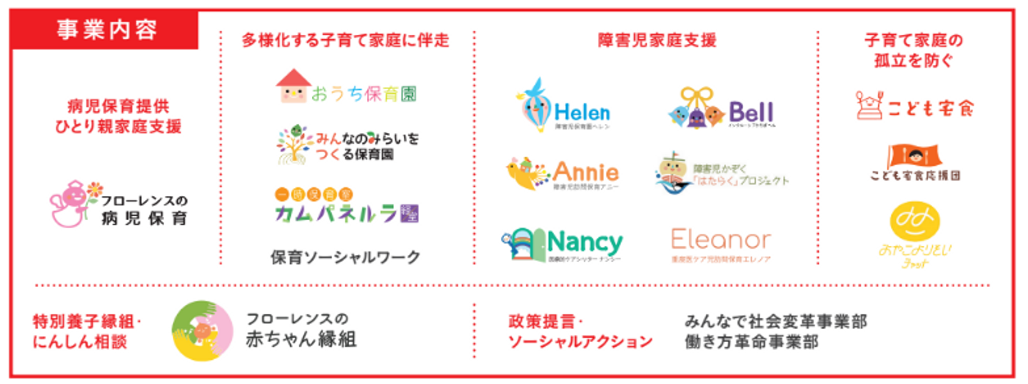 病児保育事業にはじまり、障害児家庭支援事業、にんしん相談・赤ちゃん縁組事業、保育ソーシャルワーク事業、こども宅食事業、そして東日本大震災をきっかけに活動を続けている仙台支社での保育園事業を中心とした親子支援事業など、フローレンスの活動は多岐に渡っています。