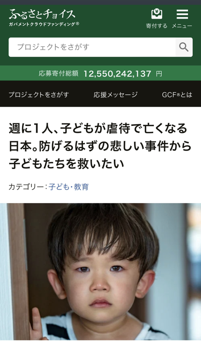 記事で紹介されていた「ふるさとチョイス」の中のガバメントクラウドファンディングというWEBページで、試しに検索窓に【こども 虐待】と入れてみました。