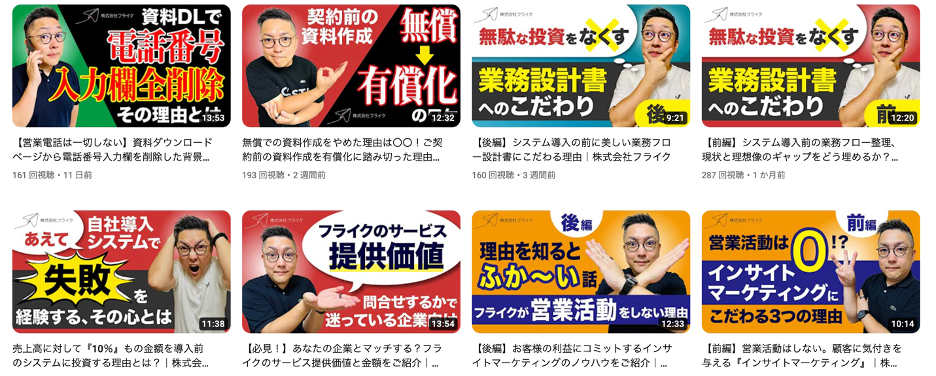 ですので、僕は違う方法でクライアントがほしいと考え、行き着いたのが、インサイトセールス※2という営業スタイルでした。例えば、フライクが提供しているYoutube※3や事例記事はすべて無料で、そこからの問い合わせが多いのですが、その問い合わせがあった段階で「お客様をフライクのファン」として対応し、商談を始めます。そして契約に結び付ける。つまり、問い合わせ時点でフライクに興味を持っていただいているので、最初からクライアントのエンゲージがすごいんです。この法則に確信が持てたので、創業当時から営業職はとらないというやり方にしています。