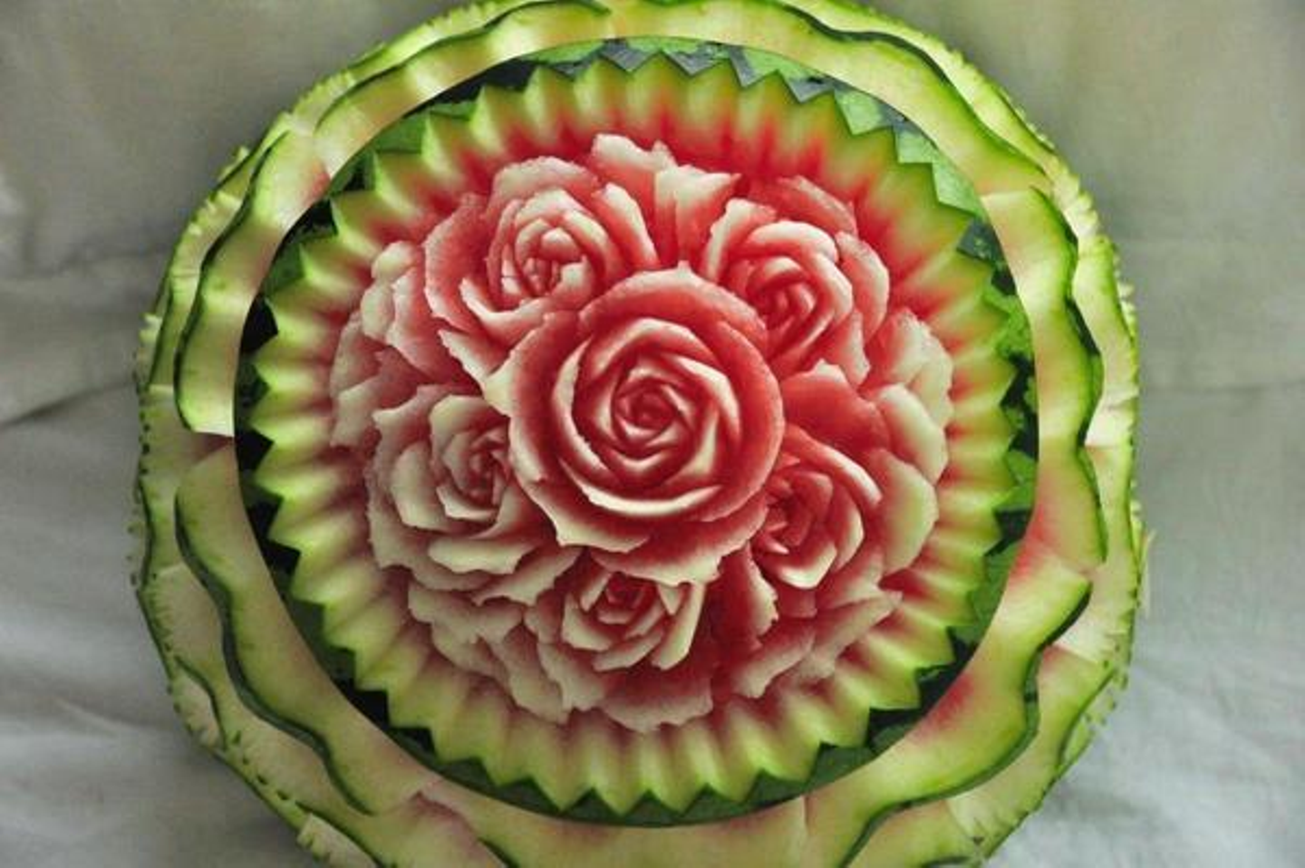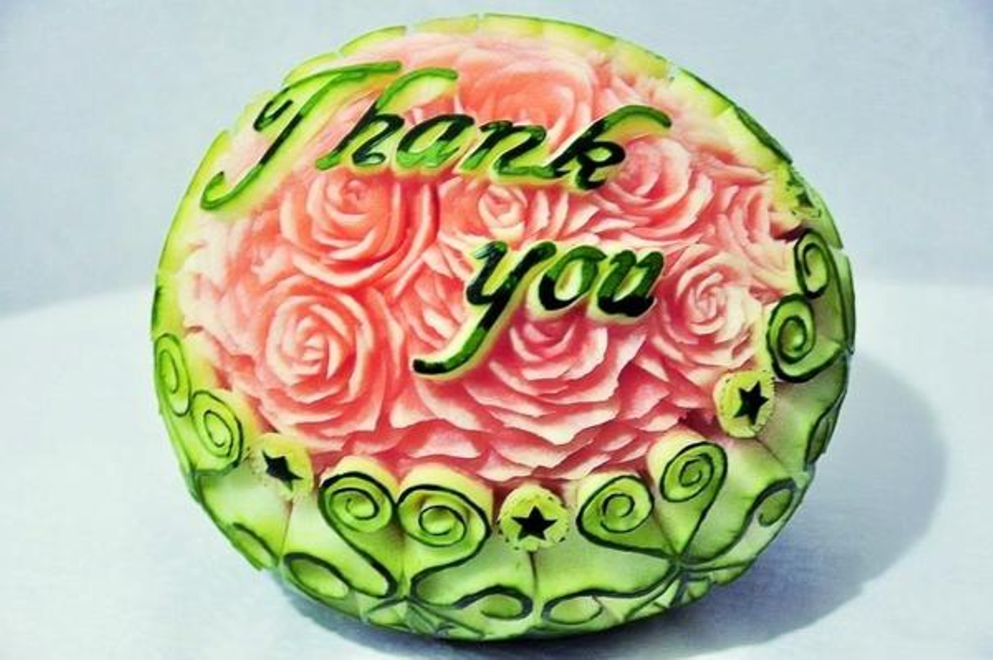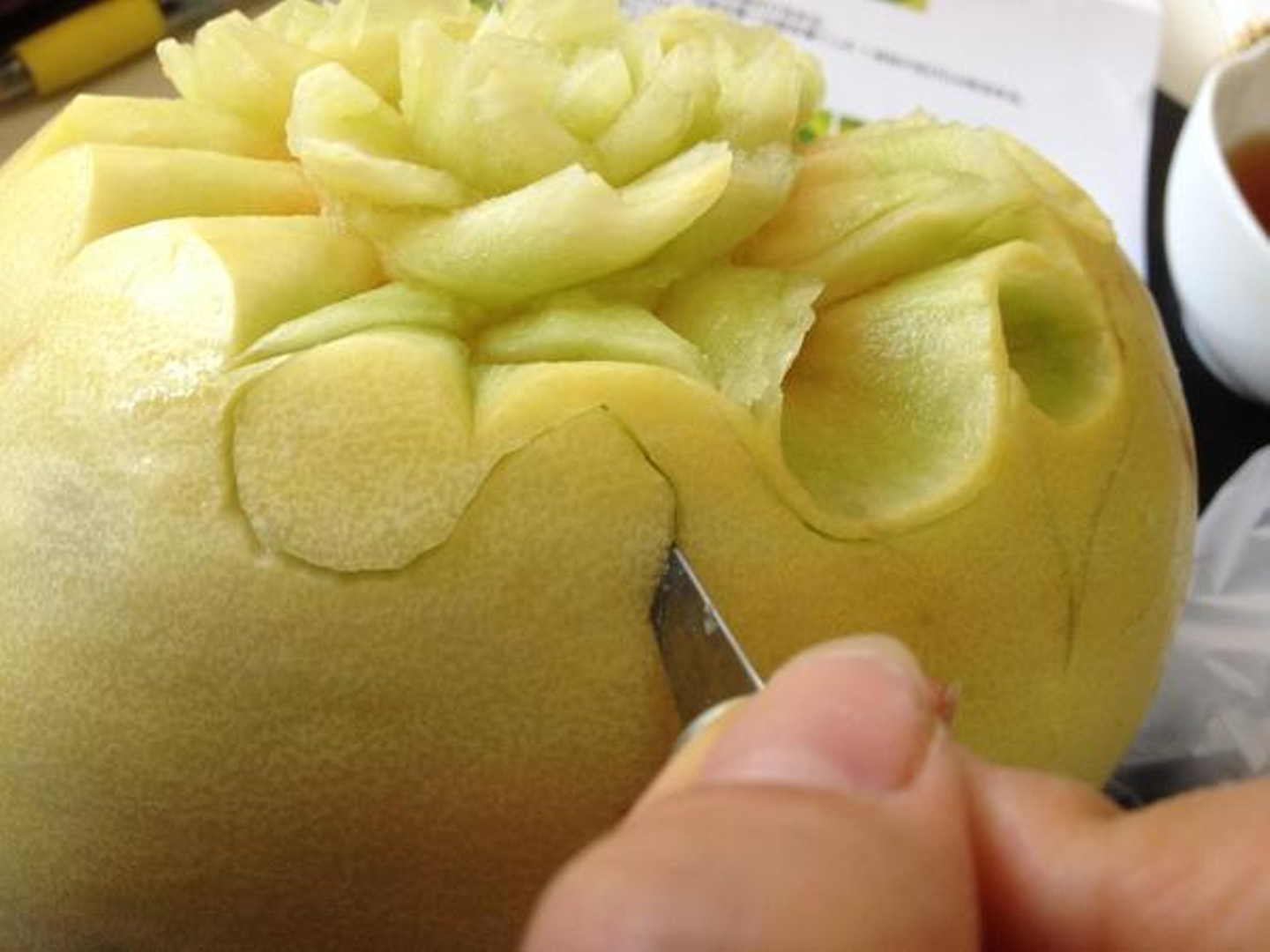 辻)始めたのは15年程前だと思います。タイに旅行に行った際に、スイカを彫っている所を見学する機会があり、その美しさに魅了され、食い入る様に見ていたのを覚えています。「自分でも彫ってみたいなぁ」と思い、帰国後すぐにタイカービングについて調べました。