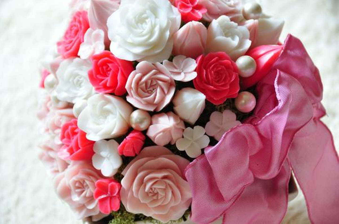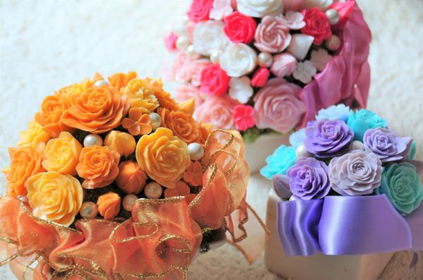 辻)自信作といわれると ?(ハテナ)ですが、よく結婚式で両家の両親に花束のプレゼントというシーンがありますよね。私たち夫婦はそのプレゼントにソープカービング(石鹸の彫刻)でお花を彫り、アレンジメントを渡しました。夫にも教えながら、一緒にカービングをしました。(不器用で危なっかしくてヒヤヒヤしましたが。)ふたりで手作りのものを渡せた事、両親がとても喜んでくれて、今でも飾っていてくれている事がとてもうれしく思い出深い作品となっています。