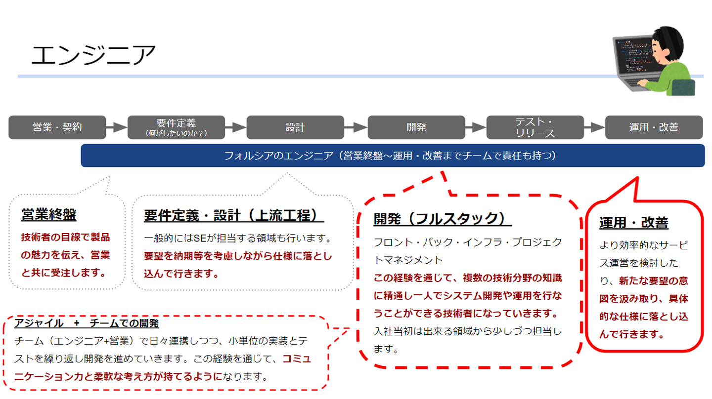 フォルシアのエンジニアが成し遂げたいこと、なすべきことというのはここにまとまっているように思いますが、実際私がいまどういう業務を担当してるのかというと、赤線で囲っている部分となります。