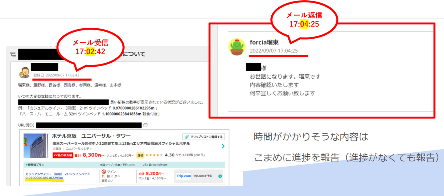例えば上記の例でいうと、顧客企業の担当者の方から、宿泊施設のプラン表示に、ベッド幅のサイズが小数点以下10桁程表示されてしまっているというような連絡がありました。これはまずいと思うものの、取り急ぎすぐには原因がわからないので、まずは「確認します」ということを2分後くらいに返信しています。