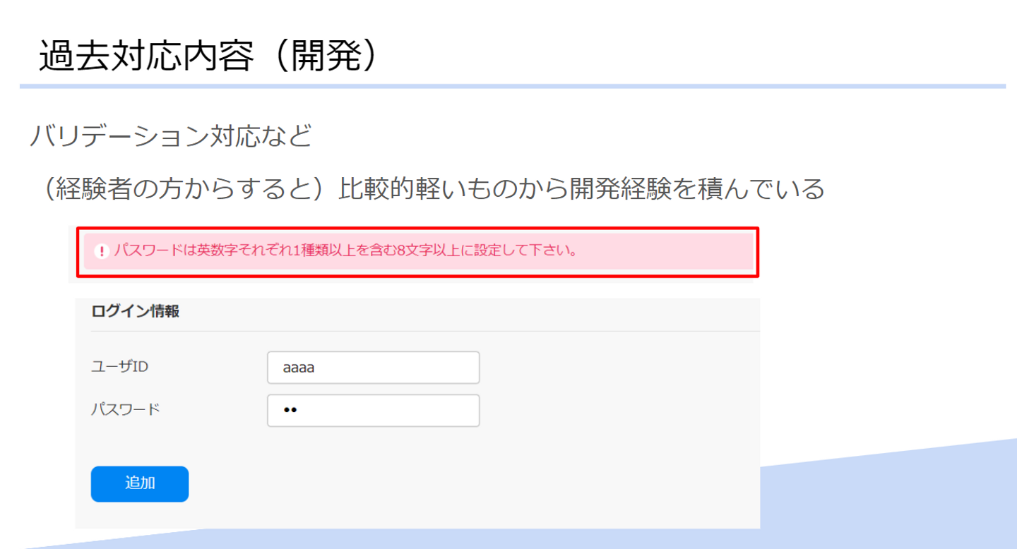 一方、開発の部分では、例えばログイン情報でパスワードを打ったときに「パスワードは8文字以上に設定してください」といったチェックロジックとアラート表示といったバリデーション対応など、開発経験者の方からすると比較的軽いと思われるものをから少しずつ開発経験を積ませていただいているところです。
