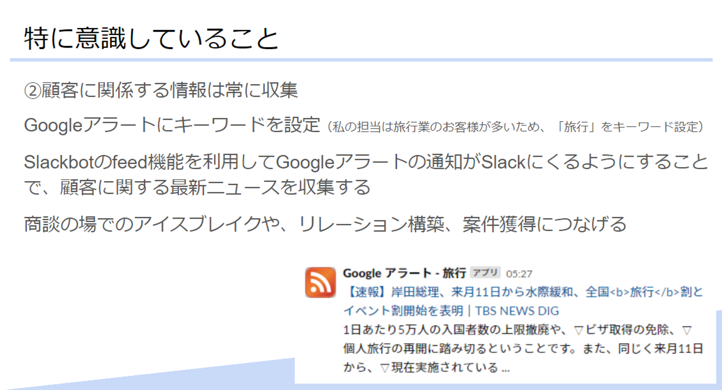 これは私の情報収集方法の紹介になるのですが、私は「Googleアラート」という機能を活用しています。キーワードを設定しておくと、定期的にGoogleがそのキーワードをもとに関連する情報を取得して配信するというもので、その機能とSlack(社内で利用しているチャットツール)を連携させて、SlackにGoogleアラートの通知が常に来るようにすることで、最新情報を取得できるようにしています。こうして得られた情報を活用して、打ち合わせ冒頭のアイスブレイクでの話題に出すなど、お客様とのリレーション構築に役立てています。実際にお客様から「そんなことまで知っていただいてるんですね!」と言っていただいたこともありますので、ぜひ皆さんもご活用いただければと思います。