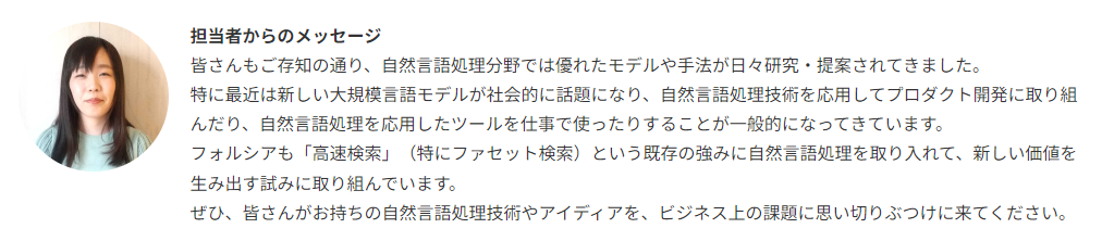Yさんはフォルシアで一番の自然言語処理の専門家です。自然言語処理の重要性は以前よりフォルシアでも認識されていましたが、従来の検索とは必要な技術スタックが異なり積極的に取り組みづらい背景がありました。そんな中、自然言語処理の豊富なノウハウを持ったYさんが入社し、新規アプリの立ち上げや既存アプリへの導入など、フォルシア内での自然言語処理の利用が一気に進みました。配属外の活動にも積極的で、本インターンの企画チームのリーダーもつとめています。