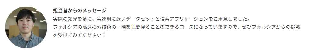 フォルシアといえば高速検索ですが、その技術の一端を学ぶことができるのが本コース。メンターは2020年に新卒入社したY.Y.さんです。