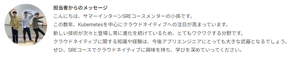 新しい技術に触れながら広い視点でSREの意義や概念について学びたい方は、ぜひ本コースがオススメです!