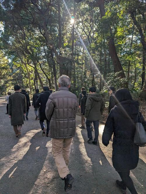 オフィスから徒歩20分。毎年仕事始めの日は天気が良く、今年も柔らかな日差しが降り注ぐ中、みんなで歩いて本殿に向かいます。