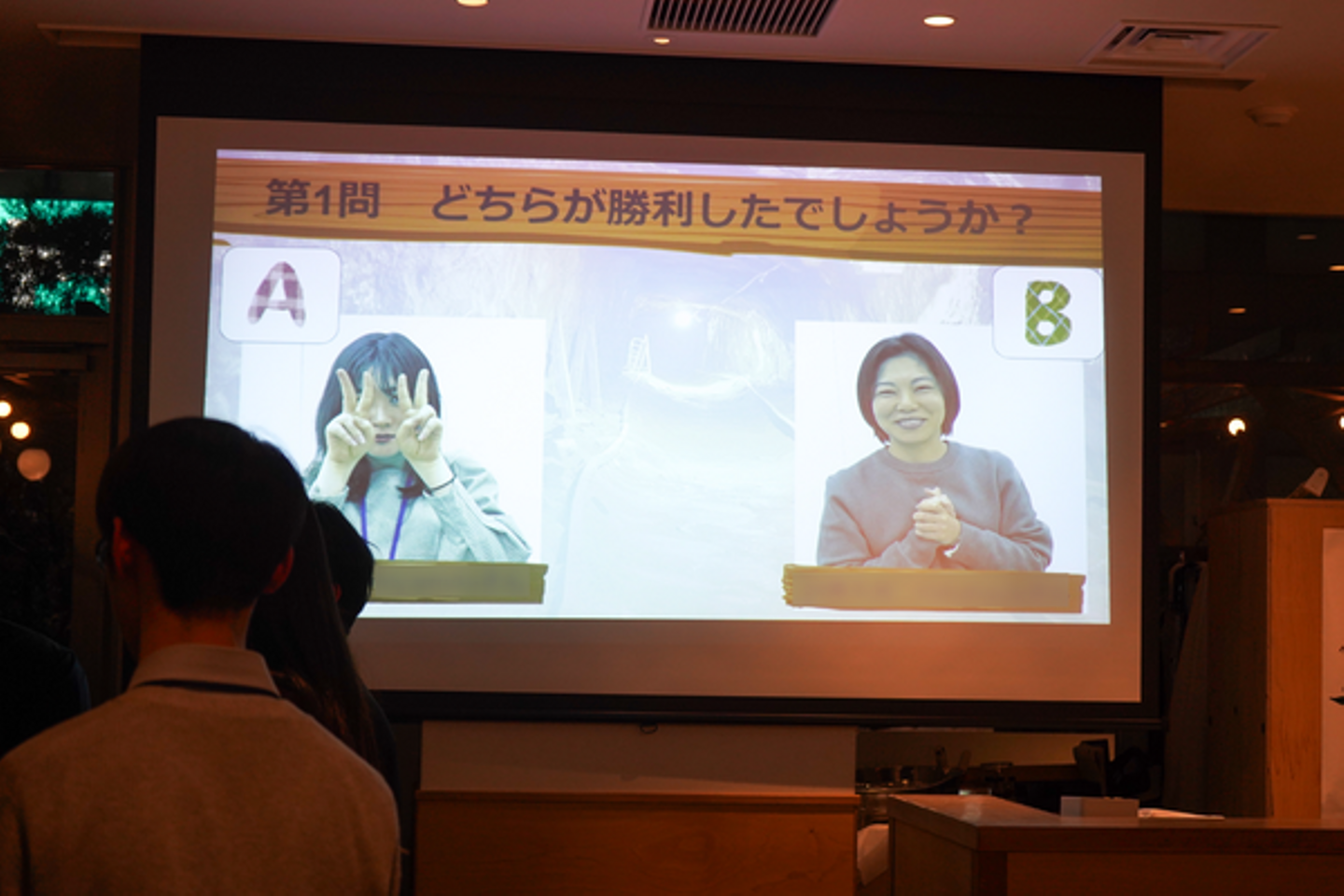 本番の会場では意気込みを語る動画を流したうえで、「この社員とこの社員、どちらの握力が強かったでしょう?」という2択形式のクイズを出題し、チームで話し合ったうえでどちらかに投票してもらうという内容です(残念ながら本家風のトロッコのセットを作る余裕まではありませんでした......)。