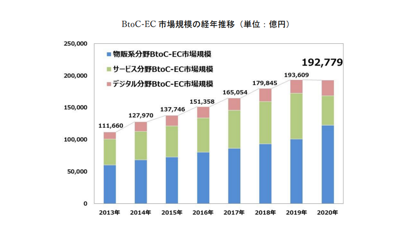 ECサイト市場規模を見ると、年々右肩上がりで成長を続けていることがわかります。