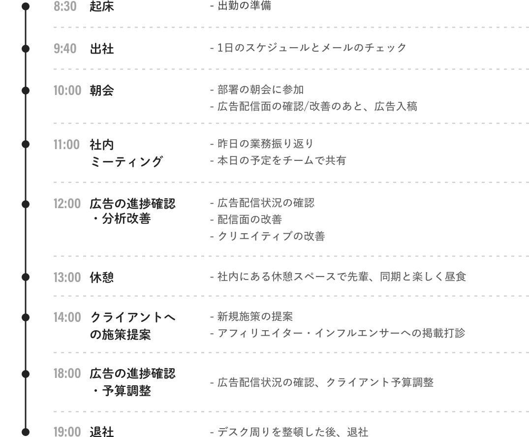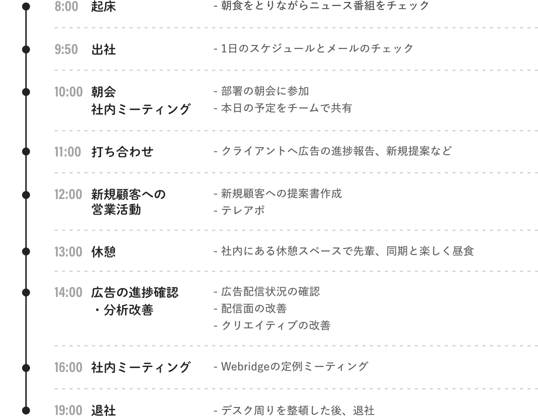 K.Cさんと同じく日系企業を担当しているので比較的スケジュールが立てやすく、一日のスケジュールはだいたいこんな感じです。