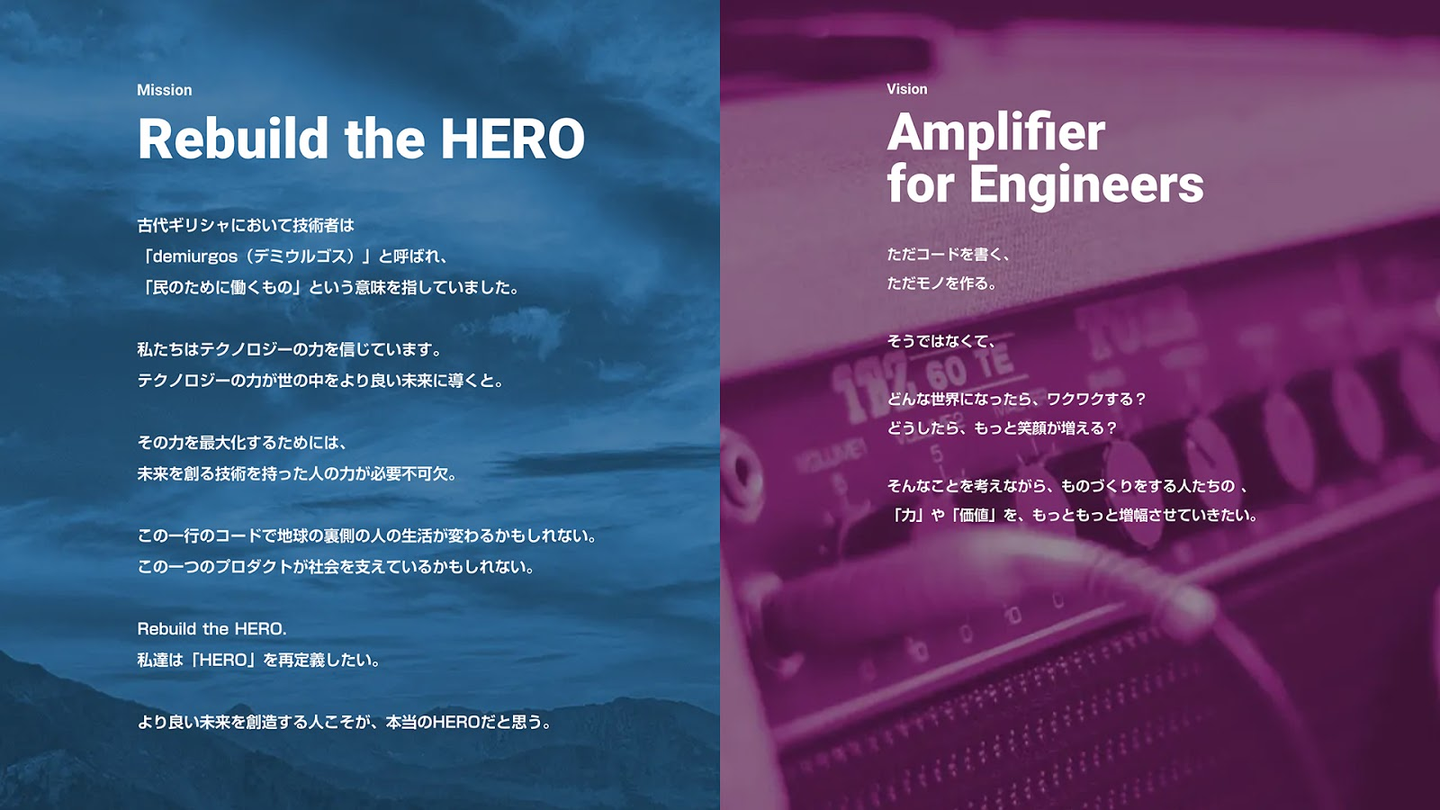 ミッションは「Rebuild the HERO」、ビジョンは「Amplifire for Engineers」。HEROの定義を「Rebuild」、私たちが変えていく。そして「Amplifire」は、音響機器のアンプと同じで、「音を拡張する、チューニングする」という意味です。エンジニアを拡張する。ミッション、ビジョンには、私たちがそのような存在になるという決意を込めました。
