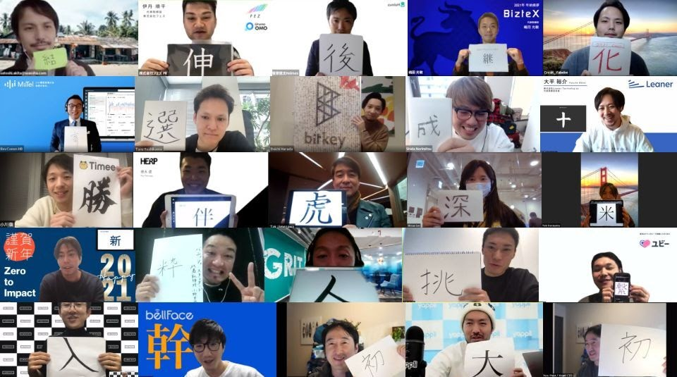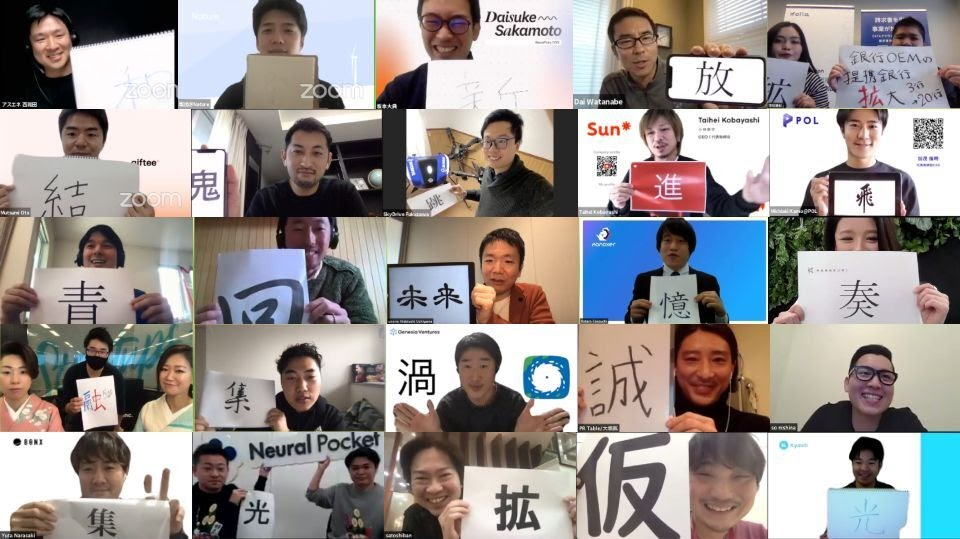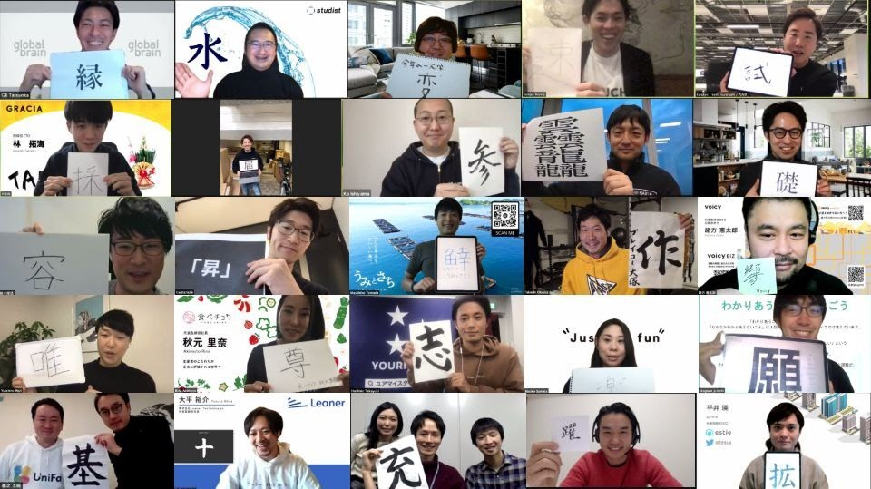 当日は、朝9時から夜にかけて10時間の間、オンラインで1社5分というとても短い時間にも関わらず、日本を代表する103社のスタートアップスの方々に新年のご挨拶とともに今年の抱負を漢字一文字と合わせて教えていただきました。