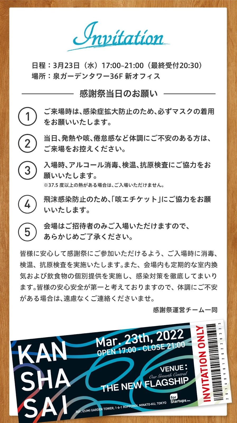 フォースタ感謝祭とは、日頃お世話になっている起業家や投資家、スタートアップエコシステムに関わるみなさまを弊社新オフィスにお招きし、改めて日頃の感謝をお伝えすると共に、より一層のご支援・ご協力をさせていただくための交流の場となります。今回は新型コロナウイルスの状況を鑑みて、抗原検査を行った上での参加を必須とし、万全の感染対策を行った上で開催いたしました。ご参加いただいたみなさまからは、オフラインで集うことに意義があり、大変有益な時間だったとの好評価を頂戴いたしました。