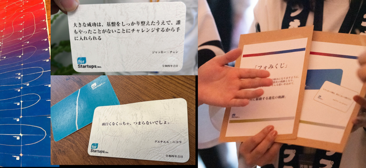 人生に影響を与えた数々の力のある言葉を集め、感謝祭にご参加くださった方々の一年の励みになるよう祈念して創りました。この言葉たちに想いをのせつつ、ご縁をつなぐ意味を込めて、フォみくじの裏面には「線」を描いています。